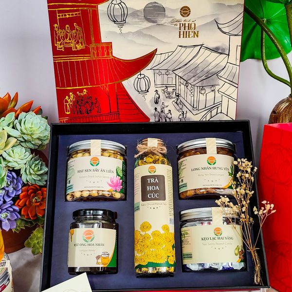 Tinh hoa từ Phố Hiến: Hộp quà Ngũ phúc của chúng tôi được chọn lựa kỹ càng với những món ăn truyền thống ngon miệng như : long nhãn Hưng Yên, kẹo lạc hai nắng, mật ong hoa nhãn, trà hoa cúc chi, hạt sen sấy giòn ăn liền. Với hương vị độc đáo và tinh túy, những món ăn này sẽ mang lại niềm vui và hạnh phúc cho gia đình bạn trong những ngày Tết sum vầy.
